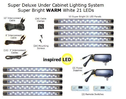Do you look for Super Bright LED under cabinet cove, Full kit, 10 light panels, 2 powersupplies, warm white LEDs!?. Today if you buy from AMAZON you can get gold price and guarantee shipping.