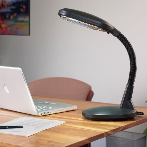 Product DescriptionOriginal Natural Spectrum? Energy-Saving Desk Lamp. The Original Natural Spectrum Desk Lamp utilizes over 50 years of research expertise to create a versatile and practical lamp. Verilux Parabolic Grid Diffuser eliminates glare and gives colors vibrancy. Flicker Elimination Technology reduces fatigue, eyestrain and headaches. A flexible gooseneck and 2 levels of illumination place indoor daylight exactly where you want it. The Original also has an advanced electronic ballast system that assures no-buzz operation; instant-on, flicker-free illumination and zero power usage when the lamp is off. Included Verilux bulb uses Trucolite Phosphor Technology to produce original full-spectrum indoor daylight. Bulb delivers 150W of light from 27W and lasts 10,000 hours more than 10 times the life of traditional bulbs. UL listed in United States and Canada. 1-year limited warranty.